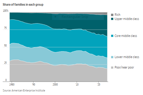 Today, I discuss the changing nature of the U.S. middle class. First, some definitions from the American Enterprise Institute (AEI). To be specific, for a household size of three, we divide income classes into five groups: the Poor (under $40,000), the Lower-middle class ($40,000 – $67,000), the Core-middle class ($67,000 – $133,000), the Upper-middle class ($133,000 – $400,000), and the Rich (above $400,000). Other household sizes have appropriately different cutoffs. Incomes are stated in 2024 dollars, and adjusted for inflation.