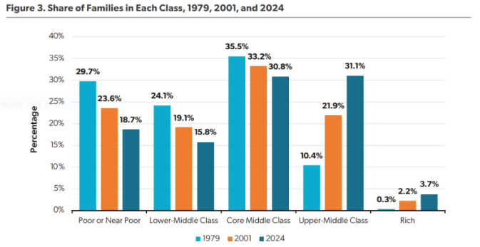- Now look at the percentage changes for each group in 1979, 2001 and 2024 (see below). Clearly, the size of the Poor group and the Lower-Middle Class group are shrinking greatly, the size of the Core-Middle Class group is slightly shrinking, and the size of the Upper-Middle Class is expanding greatly.