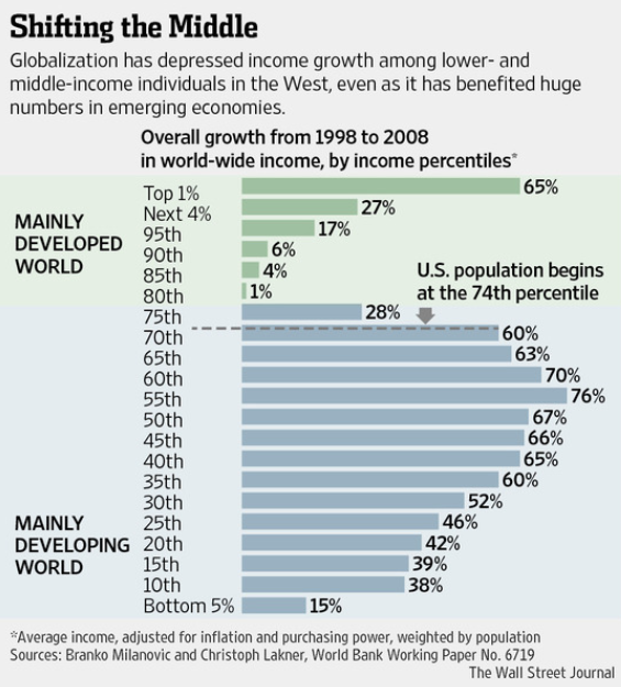 CaptureIt is clear from this chart what is going on around the world.  The top 1% makes its money from capital investments and historically the return on capital exceeds economic growth.  The next 9% are both the skilled workers and the educated professionals who are benefitting from the growth of  knowledge industry.  The medium skilled middle class in the developed world, from the 75th percentile through the 90th percentiles, are the ones who are seeing the smallest income gains.  Their jobs are being eliminated by the force of globalization which is shifting lower skilled work to lower paid workers in the developing world.