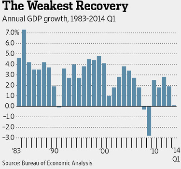 Such a slow rate of growth causes all sorts of problems. First of all, it explains why our unemployment rate is still so high at 6.7% after five years of recovery. This means that between 15 and 20 million people are still unemployed or underemployed. Such a large human toll means a huge increase in government welfare expenses for food stamps, unemployment insurance, etc. Higher unemployment also means less tax revenue collected by the federal government. This translates into much larger deficit spending, adding to the already massive national debt.