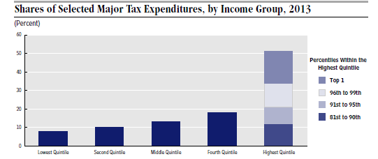 In fact, crony capitalism has a much wider scope than this. Each year deductions and loopholes in the U.S. tax code, referred to euphemistically as tax expenditures, total $1.2 trillion in lost tax revenue. As the above chart from the Congressional Budget Office shows, 50% of these tax reductions are enjoyed by the highest earning 20% of all U.S. households, with 30% of the benefits going to just the top 5%.