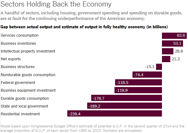 In today’s New York Times the economics writer, Neil Irwin, has an article “Why Is the Economy Still Weak?  Blame These Five Sectors.”  The five sectors are, in order of magnitude of effect: housing, state and local governments, durable goods consumption, business equipment investment, and federal government.  See the chart below.