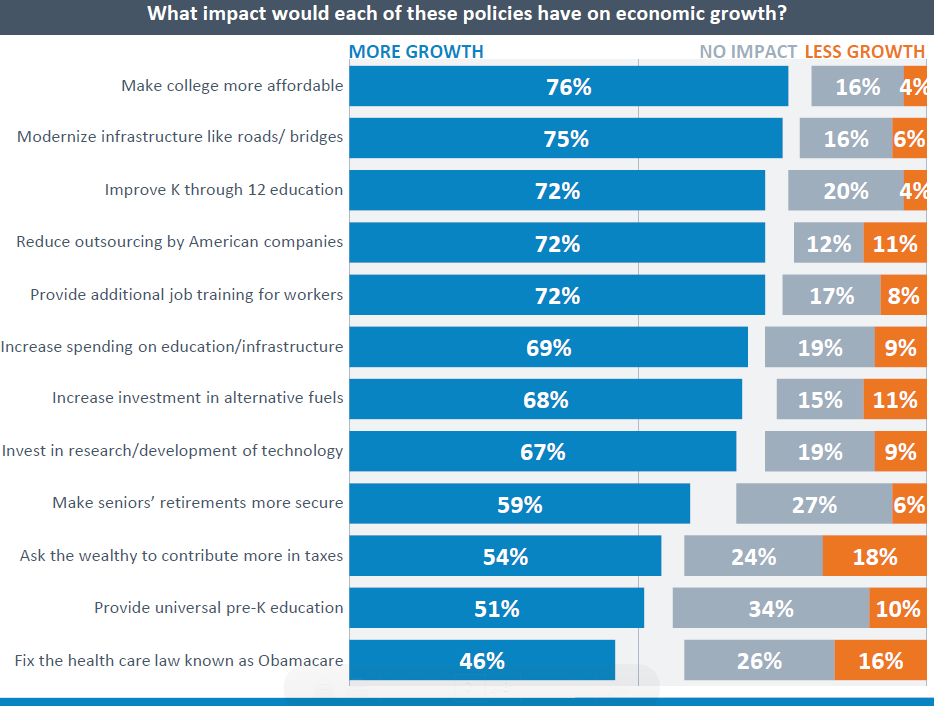 GSG then goes on to list various possible growth strategies in order of voter popularity such as making college more affordable, modernizing infrastructure, improving K-12 education and others (see below). This list of possible growth strategies is made up mostly of new spending programs. The less costly might be doable by reforming existing spending programs. But expensive new programs simply will not fly in today’s high deficit environment.