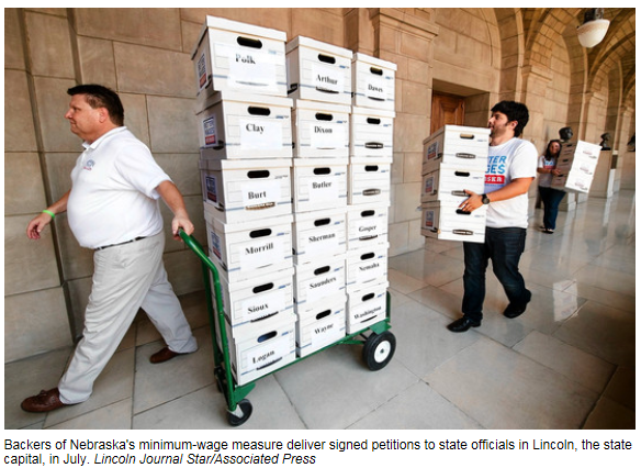 CaptureThe Wall Street Journal reports, “Some Republicans Back State Minimum-Wage Increases,” that five states, including Nebraska where I live, have minimum-wage proposals on the ballot this year. In Nebraska the minimum-wage would increase in two steps to $9.00/hour from $7.25.  Nebraska’s unemployment rate is currently 3.6%, and it is estimated that there are only 27,000 people in the state being paid the minimum wage.  In other words, Nebraska actually has a labor shortage and it is unlikely that a mild increase in the minimum wage will put very many people out of work.