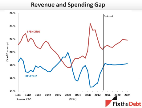 The deficit for fiscal year 2014-2015 just ended is “only” $483 billion, about 2.7% of current GDP, and some observers are saying this means that our deficit and debt problems are now under control and we should stop fretting so much about them.