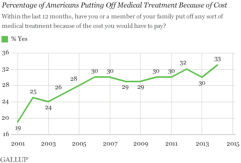 But as the above chart from a recent Gallup survey indicates, the cost of healthcare is now a big barrier for an increasing number of people with health insurance.