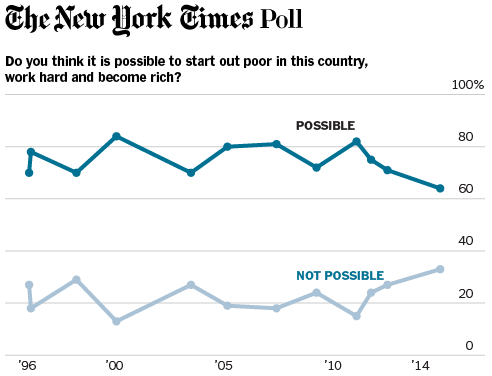 Today’s New York Times has such an article, “Many Feel American Dream is Out of Reach, Poll Shows,” pointing out that 64% of a NYT Poll respondents think that it is possible to start out poor and become rich (see above chart), which opinion has dropped from 72% in 2009. The Poll also reports that: