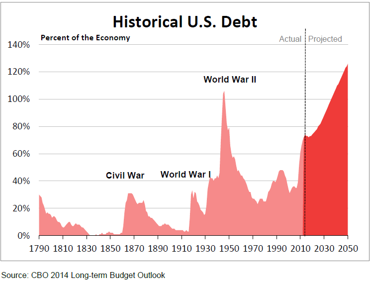Unfortunately our federal government has gotten away from this principle in recent years. This is clearly demonstrated in the above chart which shows an already very large national debt getting much, much worse in the coming years.
