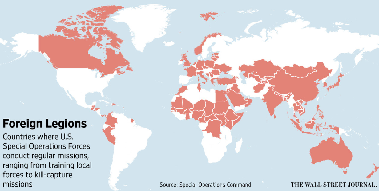 In this regard, the Wall Street Journal has just published an informative article, “New Way the U.S. Projects Power around the Globe: Commandos.” The U.S. Special Forces currently has 70,000 people in uniform and an annual budget of $10 billion. Last year they operated in 81 different countries on six continents. For example: