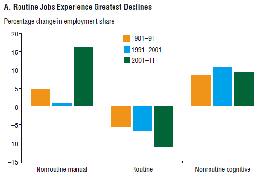 My last post reported on a new book by James Bessen, “Learning by Doing: the real connection between innovation, wages and wealth.”  It makes several recommendations for how the U.S. can better meet the challenges posed by the hollowing out of the middle class, as illustrated in the chart just below from the Dallas Federal Reserve.