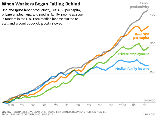 Just published in the latest issue of the Harvard Business Review, “The Great Decoupling: an interview with Erik Brynjolfsson and Andrew McAfee” is a more focused analysis of what is happening. These two technology experts note that both labor productivity and GDP are growing much faster than the growth in the number of jobs as well as median family income. This is what they refer to as the great decoupling. They are careful to point out that the same trends are happening in other developed countries such as Finland, Germany and Sweden.