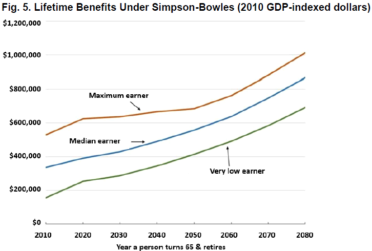 - Myth: Social Security reform is code for slashing benefits, especially for the poor. Fact: under most reform plans, benefits would continue to grow faster than inflation. Most reform plans do not cut benefits from their current levels but rather slow the growth of benefits to reduce some of the pressure that wage-growth and rising life-expectancy place on the program. Under the Simpson-Bowles Plan, for example, benefits for low-wage earners will grow much faster, proportionally, than for higher-wage earners (see above chart).