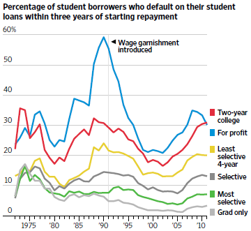 • The percentage of student borrowers at for-profit as well as community colleges who default on their loans has greatly increased since the year 2000 (see below)