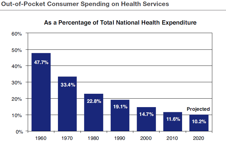 First of all, out-of-pocket consumer spending on healthcare has been steadily declining for many years. The less we pay directly for our own healthcare, the less incentive we have to control costs.
