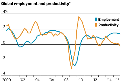 Two recent newspaper articles address the slow growth problem. Greg Ip, writing in the Wall Street Journal, points out that (worldwide) employment growth is up while productivity growth is down (see chart below).
