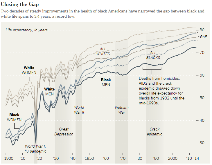 Today I am pleased to refer to an article in yesterday’s New York Times, “Black Americans See Gains in Life Expectancy.” In fact, the black-white life expectancy gap has dropped from 7 years in 1990 to 3.4 years today. This is for a multitude of reasons: