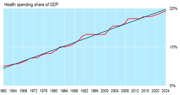 The fundamental reason why U.S. healthcare is so expensive is that Americans do not have enough “skin in the game.” The above chart shows that our direct out-of-pocket costs for healthcare have been steadily dropping for the last fifty years as the role of health insurance has expanded. This means that we simply don’t have enough personal incentive to hold down healthcare spending on our own.