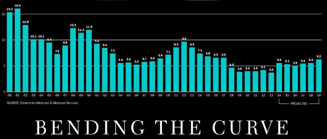 The Omaha World Herald had an article on Sunday, “Bending the Curve,” purporting to show that cost increases for total national healthcare spending are dropping (see just above). The problem is that these supposedly low price increases in recent years are still twice the rate of inflation which is now averaging under 2% per year. This means that even 4% – 5% price increases per year are much too high and need to be curtailed even further.