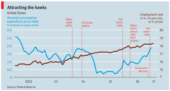 - The Federal Reserve is continuing to raise interest rates, confident that fundamental data on employment and inflation (see chart) is looking more and more positive.