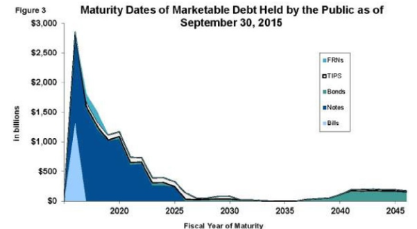 - Most of our debt is financed with 10 year Treasury Notes. “Of the marketable securities currently held by the public as of 9/30/15, $7.4 trillion or 58% will mature within the next four years.” (see GAO chart) In other words, the huge increase in debt over the past 10 years will soon have to be paid for by Treasury. This will almost surely cause more inflation which will lead to a further increase in interest rates.