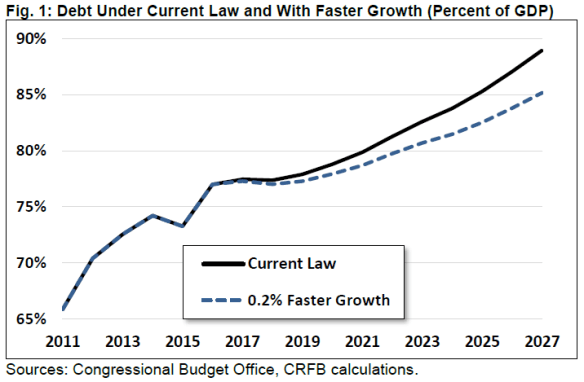 - Promote Economic Growth and Dedicate the Gains to Deficit Reduction. The Joint Committee on Taxation and the Treasury Department have estimated that comprehensive tax reform can increase the growth rate of GDP over the next decade by .05 to .25% per year. For example, a .2% increase would reduce our debt by $550 billion over ten years (see chart). This does not fix our fiscal problems but it helps.