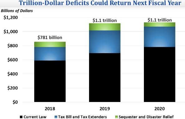 The huge problem, of course, is that the tax rate cuts are not paid for by other offsets and will add $1 trillion over ten years to our already exploding national debt. In fact, we are likely to see trillion dollar deficits again as soon as FY 2019.