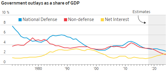 Today take a look at a WSJ article comparing outlays for defense, non-defense and net interest payments on our debt. It shows how interest payments on our debt are likely to exceed spending on all discretionary non-defense programs by 2022.