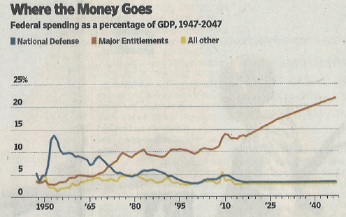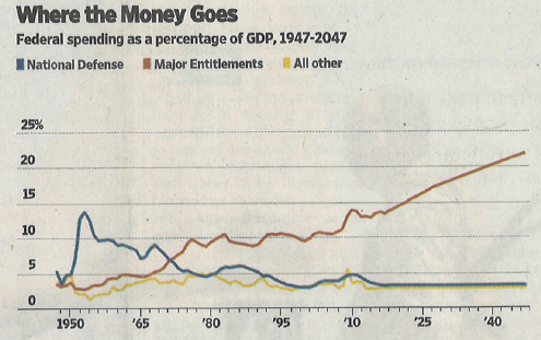 The Hoover Institution analyst, John Cogan, summarizes our dire fiscal situation in the above chart which compares three major categories of federal spending since 1950: defense, entitlements and all other. Entitlement spending is steadily increasing. The other two categories have stabilized at about 3.5% of GDP each.