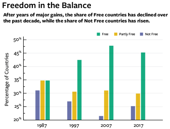 Freedom and democracy around the world. Freedom House rates democracy around the world as very strong even if there are several instances of nationalistic retrenchment. See chart below: