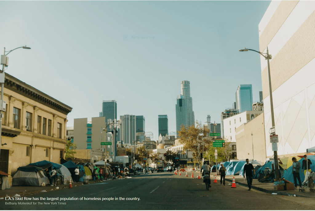 Homelessness. Los Angeles has an estimated 44,000 homeless people living on its streets. Homelessness is worsened by the rapid influx of high paid tech workers into our largest cities which results in a huge housing shortage. See picture below: