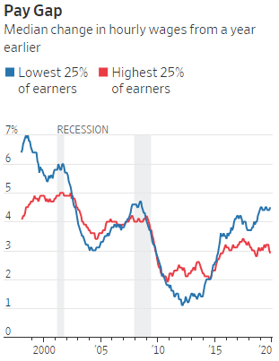 Low wage workers are finally getting the biggest raises. In the last few years the wages of the lowest paid workers are finally beginning to increase significantly. This is because the unemployment rate, under 4% (3.5% in November 2019) for almost two years, has created a major labor shortage. See graph below: