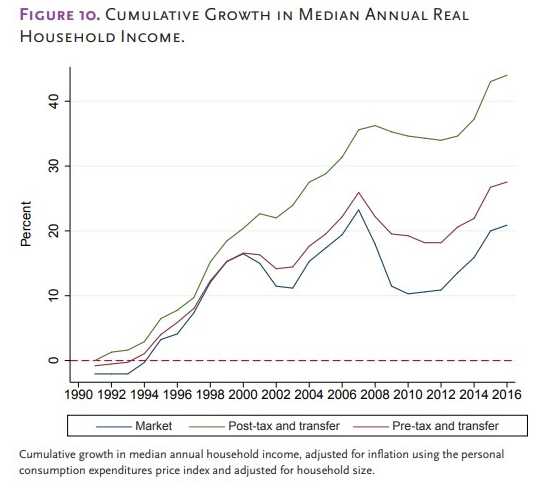 - Household income growth has not been stagnant for decades. As the figure below shows, the median household saw market income plus social insurance benefits increase by 28% from 1990 to 2016. And income after taxes and transfers grew by 44% over this same period.