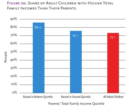 - Most Americans in their 40s are doing better than their parents were during their 40s. Again, looking at the chart below, 86% of today’s 40-somethings who were raised in the bottom 20%, have higher incomes than their parents did when their parents were in their 40s. This represents huge upward mobility from the bottom of the income distribution.