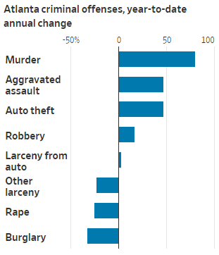 • Rising Rate of Violent Crime Shakes Atlanta.   Murders and aggravated assaults are way up in Atlanta and other big cities over the past year.  It occurred while “we were dealing with increased hostility toward law enforcement and a decreased sense of trust towards police,” says an APD spokesman.  Defund the police?  Really?