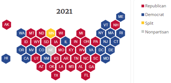 • State legislatures have become highly polarized in recent years.  31 state legislatures now have both houses Republican (including Nebraska with a non-partisan unicameral which leans Republican), 18 states with both houses under Democratic control, and only one state, Minnesota, has a divided legislature. HR1 is, in effect, an attempt by a (blue) Democratic Congress to dictate election procedures to 31 red states.