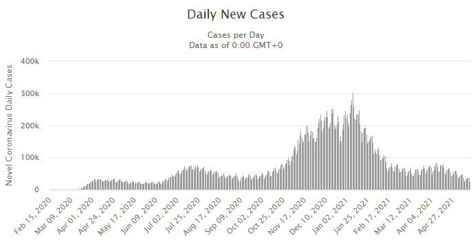 The United States is rapidly recovering from the Covid-19 pandemic, as evidenced by the steadily decreasing rate of new daily infections.  In fact, we have probably already reached herd immunity, meaning that the percentage of those infected plus those vaccinated is approaching (or exceeding) 70%.