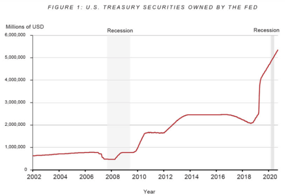 - Indications that investors are growing increasingly concerned about the U.S. fiscal and monetary picture – and are in turn assigning more risk to “risk-free” Treasury bonds – are on the rise. Between 2010 and 2020, the share of U.S. securities owned by foreign entities fell from 47% to 32%. As foreign investors reduce their purchase of U.S. government debt, the Fed is forced to increase its own bond purchases.