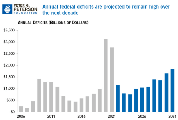 The real cause of inflation is that consumer demand is growing faster than usual while supplies are less than normal. Why is this happening? It is largely because of actions taken by Congress during the past two years of the pandemic. In fiscal years 2020 and 2021, deficit spending totaled about $3 trillion each year (see chart). Much of this spending went to individuals in the form of direct payments into their bank accounts. Unemployed workers also received an extra federal unemployment stipend of $300 per week which served as an additional disincentive to return to work. Furthermore, a more generous child allowance also created a disincentive to work.