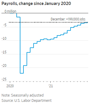 There is still a 3.6 million worker gap between February 2020, right before the pandemic started, and the present, December 2021 (see chart). This worker shortage will be harder to make up because the unemployment rate (as of December 2021) has shrunk to 3.9%. In other words, there aren’t a whole lot of workers now looking for jobs.