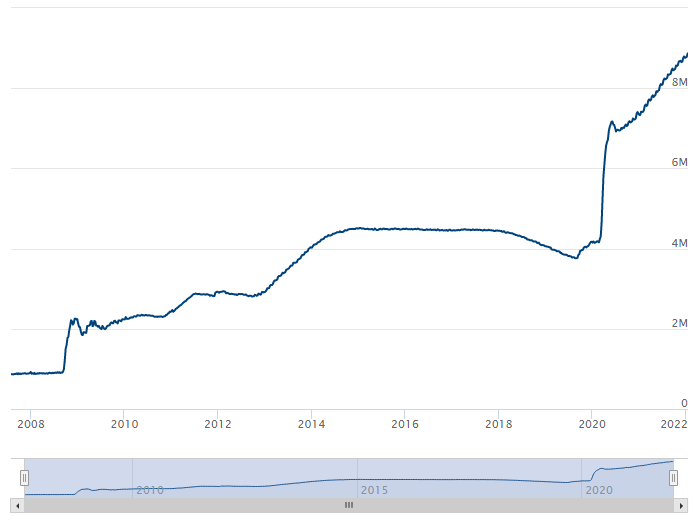 - The Federal Reserve is prepared to address inflation by both raising interest rates and reducing its eight trillion dollars in bond holdings (see chart). This will necessarily slow down economic growth and perhaps even cause a recession. So Biden is faced with a combination of rising inflation and likely economic slowdown. His favorability ratings could get even worse in the coming months if stagflation (inflation plus recession) takes hold of the economy.