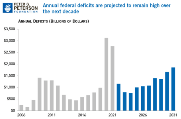 Conclusion.  Our close to $30 trillion, and rapidly increasing, national debt is not sustainable indefinitely.  National leaders, including Congress and the President, must get serious about controlling it.  It will require some economic pain for this to happen.  Perhaps the current buildup in inflation will lead to a resolution of this sequence of events: inflation, interest rates, and reduction of the ratio of debt to GDP in the near future.  If so, we will be much better off in the long run.  Hold on to your hats and your wallets!