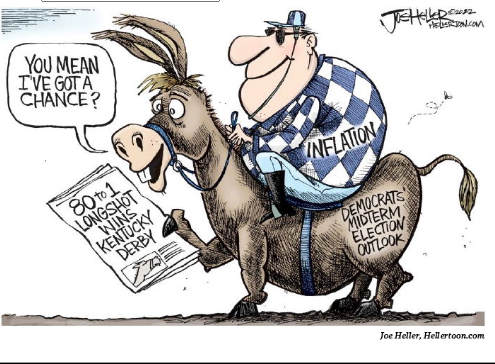 - Inflation. This is, of course, the Democrat’s biggest problem by far. Americans are reminded daily of the rapidly rising price of gasoline. Even if the annual rate of inflation continues to taper off slowly (it dropped from an annual rate of 8.5% in March to 8.3% in April), it is likely to still be high in November. In the meantime, the Fed will be raising interest rates aggressively to combat inflation and this will slow down the economy. This will likely make the current low unemployment rate of 3.6% go up, even though there is now a huge number of open jobs (11 million) in the economy. And even large current wage increases are not keeping up with inflation.