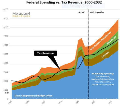 - National Debt. This is the one issue that I am less optimistic about. Our national debt is now over $30 trillion and growing rapidly. It will probably take a new financial crisis to force our national leaders to get federal spending sufficiently under control so that, at least, we stop adding to the debt and, therefore, shrink it as a percentage of GDP over time. As the attached chart shows very clearly, it is entitlement spending that is the main culprit in our massive and growing debt accumulation.