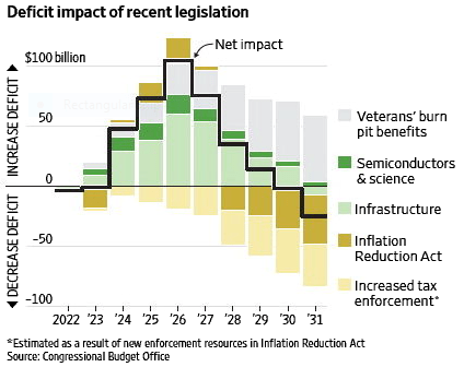 But more generally, as pointed out by Greg IP in the Wall Street Journal, the IRA is only one of several major pieces of legislation signed by Mr. Biden in the past year. For example, he signed a bill that vastly expands benefits to veterans exposed to toxic burn pits which adds an estimated $278 billion to deficits over the coming decade. The infrastructure law from late last year adds $257 billion over a decade and the semiconductor manufacturing and scientific research law adds $79 billion. This all adds up to a net increase in the deficit by $300 billion, not a $300 billion deficit decrease.