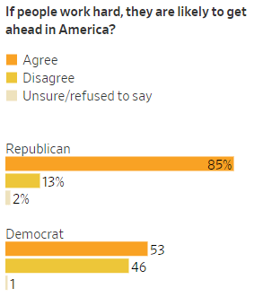 - Furthermore, 85% of Republicans think that if people work hard, they are likely to get ahead, while only 53% of Democrats agree. See the chart below.