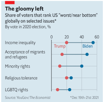 - Far more Democrats than Republicans think that the U.S. is worst or near the bottom in such issues as income inequality, acceptance of migrants and refugees, minority rights, religious tolerance, and LGBTQ rights. See the chart below.