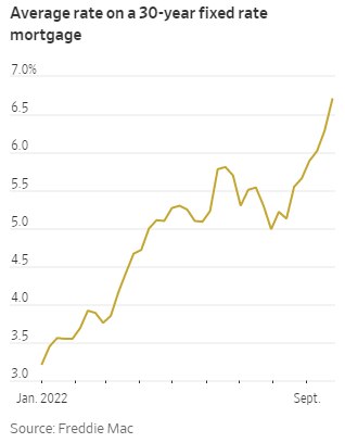 - Mortgage rates surge. The average mortgage rate is now 6.7%, the highest level since July 2007 (see chart). This adds pressure to the already cooling U.S. housing market. Many would-be home buyers have given up, while many existing homeowners have become reluctant to sell.