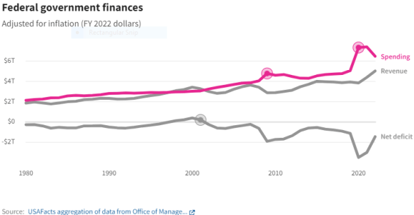 - It is apparent, from the attached chart on federal government finances, that spending got most out of whack beginning in 2009 from the financial crisis and then again beginning in 2020 from the pandemic. Of course, it is understood that crises require a government response. But now that inflation has been tripped off, fiscal restraint is badly needed to help the Fed get it back down.