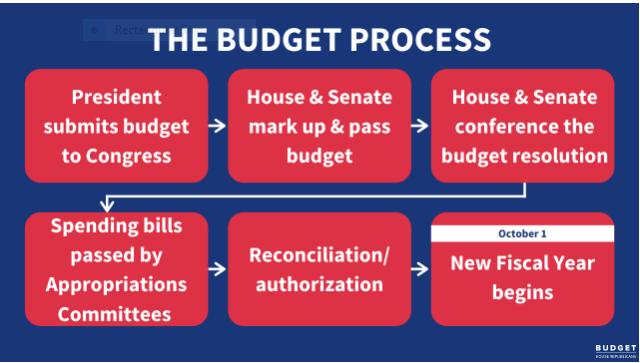 The President’s budget proposal will be unveiled on March 9, a month later than normal. Then the House and Senate Budget Committees mark up the President’s budget, pass their own individual budgets, and then come to an overall agreement through joint conference. (https://budget.house.gov/budgets/)