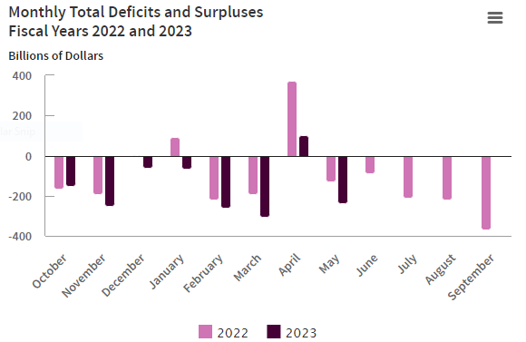 - The Committee for a Responsible Federal Budget reports that the budget deficit totaled $2.1 trillion over the past 12 months through May 2023. As can be seen from the chart below, this is because federal spending is growing rapidly while federal revenue is dropping.